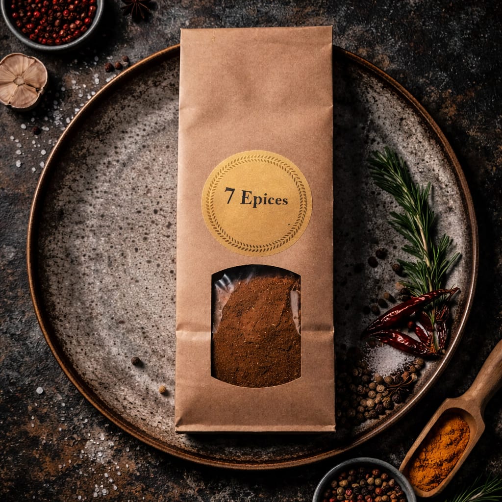 Le 7 épices est un mélange emblématique de la cuisine orientale, réputé pour sa richesse aromatique et son équilibre parfait entre douceur et intensité. Il associe plusieurs épices nobles telles que le poivre, la cannelle, la muscade, le clou de girofle, le cumin et la coriandre.